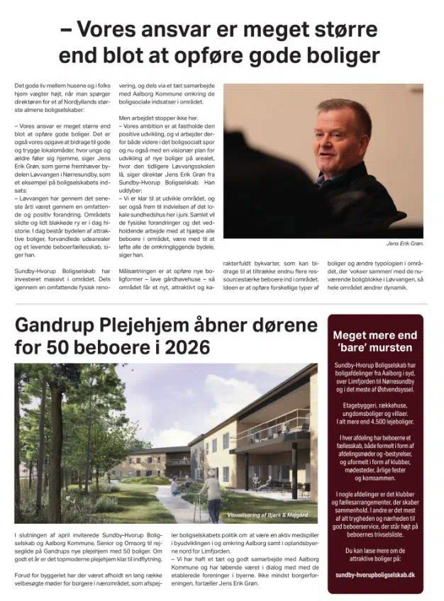 Her fortalte Jens Erik Grøn blandt andet om Sundby-Hvorup Boligselskabs helhedsplaner i Lindholm, nybyggeriet i Gandrup og boligselskabet rolle og ansvar i lokalområderne.