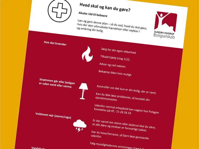 Derfor har vi lavet et enkelt ’action card’, som vi har omdelt til alle beboere i Sundby-Hvorup Boligselskab, med gode råd i tilfælde af en ulykke eller uforudset hændelse i og omkring boligen.